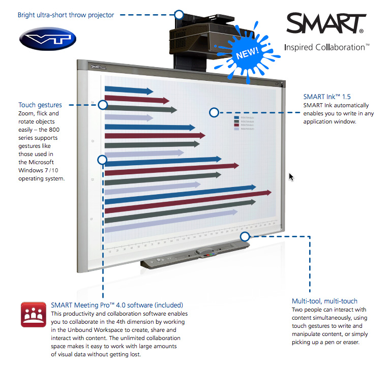 yläpuolelle kiinnitetystä Ultra-wide projektorista, vuorovaikutteisesta SMART Board